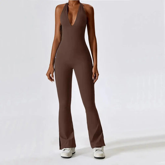 2024 Nylon Halter Backless Yoga Set Women One Piece Jumpsuit Fitness Flare Legging Gym Bodysuit Running Sportswear Outfits Suits